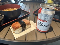 爺さんはホノルル食堂のスパム握り360円でバドワイザー550円呑んで楽しくお昼